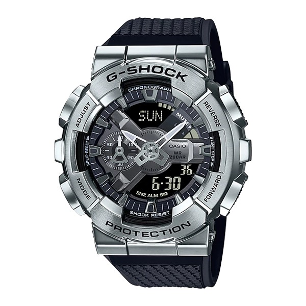 Mẫu GM-110 có gờ và mặt số màu bạc mang lại diện mạo kim loại.